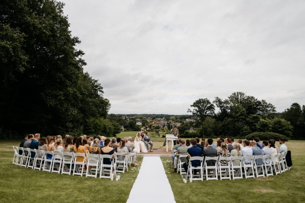 Of jullie nu groots willen uitpakken of juist kiezen voor een klein en persoonlijk moment… alle mogelijkheden zijn er. Ook heeft elk seizoen zijn eigen magie. Zomers trouwen jullie midden in het groen, terwijl de winter zorgt voor een knusse, romantische sfeer met zachte vachtjes en knisperende vuurkorven. En mocht in de zomer het weer even niet meewerken, dan zorgen wij altijd voor een passend en sfeervol alternatief binnen, óf laten we (in overleg) buiten een sfeervolle stretchtent opbouwen zodat jullie tóch kunnen genieten van het mooie uitzicht tijdens de ceremonie.
